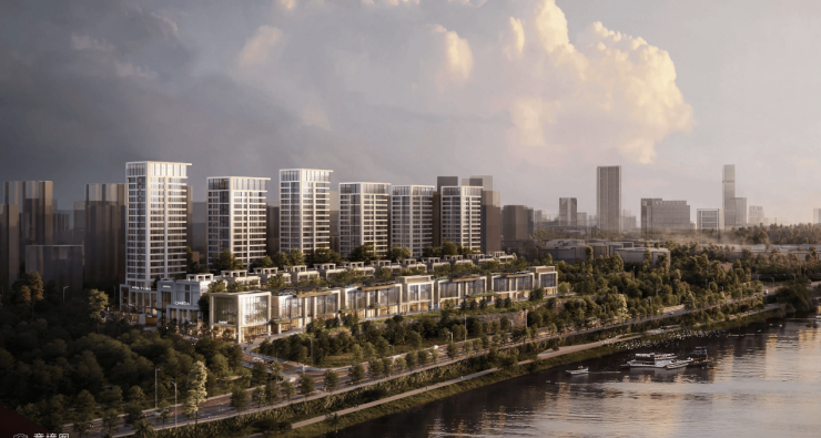 项目雄踞10米高红砂岩台地,整体容积率低于1.5,正对1.8公里锦江岸线亩滨水公园纳入项目统一规划。基地自西向东三级抬升,依势打造三排滨江奢宅,成就公里级江景视野。