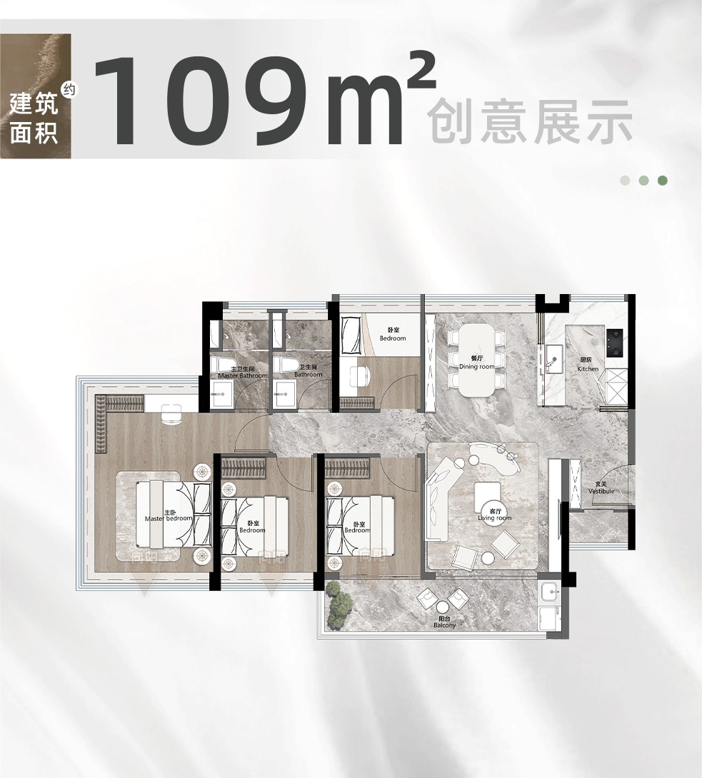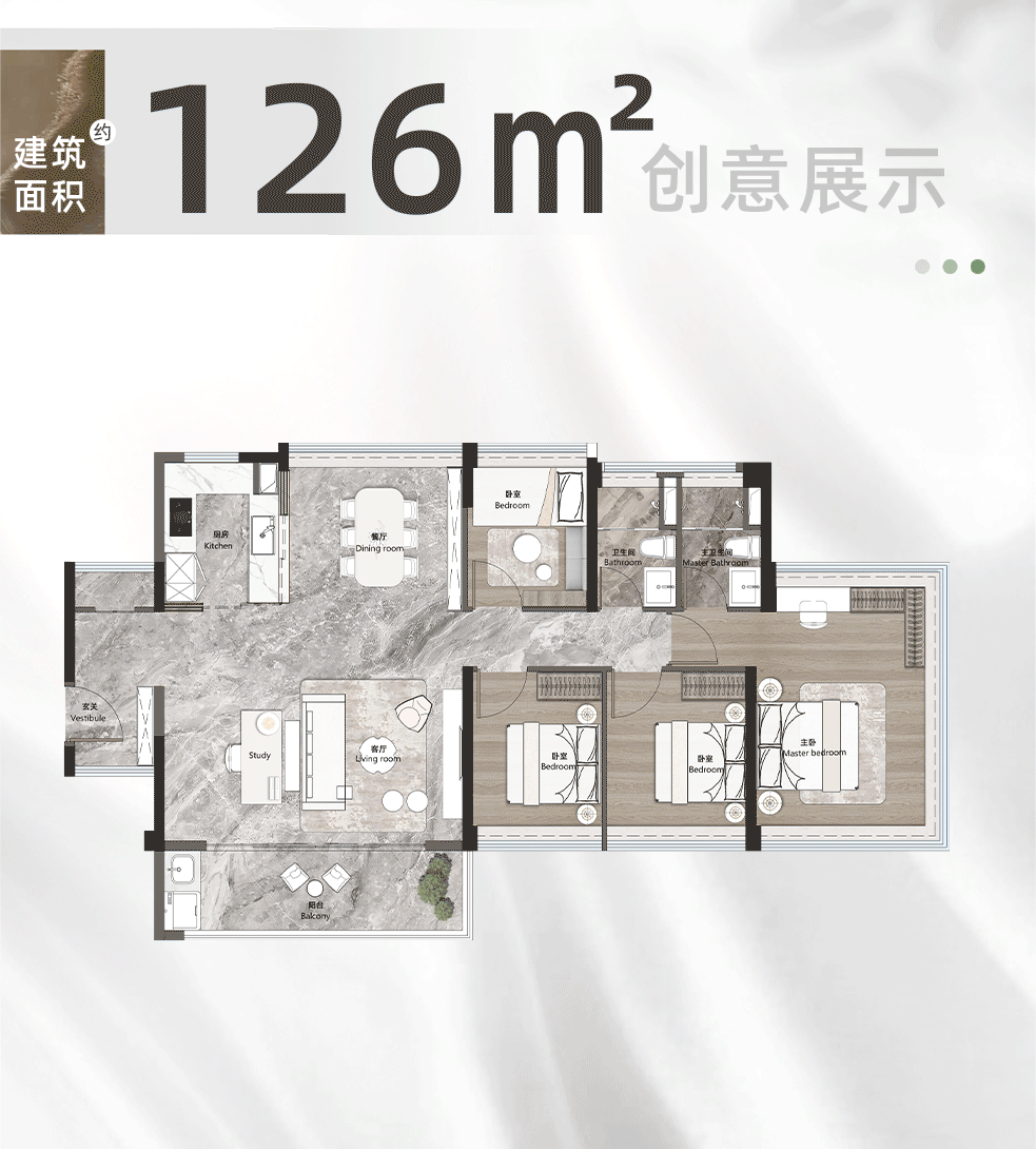 99平户型:IMAX宽景阳台、主卧三面环幕视野设计,室内就像一座移动的观景台。