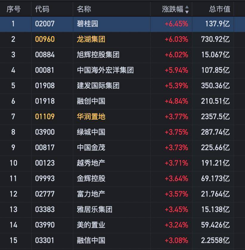 这份政策的能量不止局限于A股,香港股市的内房股也随之活跃起来。碧桂园的股价飙升了7%,龙湖集团和旭辉控股集团的涨幅达到了6%,中国海外宏洋集团同样表现亮眼,上涨了6%。建发国际集团、融创中国上涨了5%,而华润置地、绿城中国、中国金茂、越秀地产、金辉控股、富力地产等一线房企的股票,涨幅也普遍在4%左右。雅居乐集团、美的置业、融信中国、新城发展、万科企业等,涨幅也有3%。可以说,在当天的整个大中华区股市中,房地产板块无疑成为了绝对的主角,吸引了全部目光。