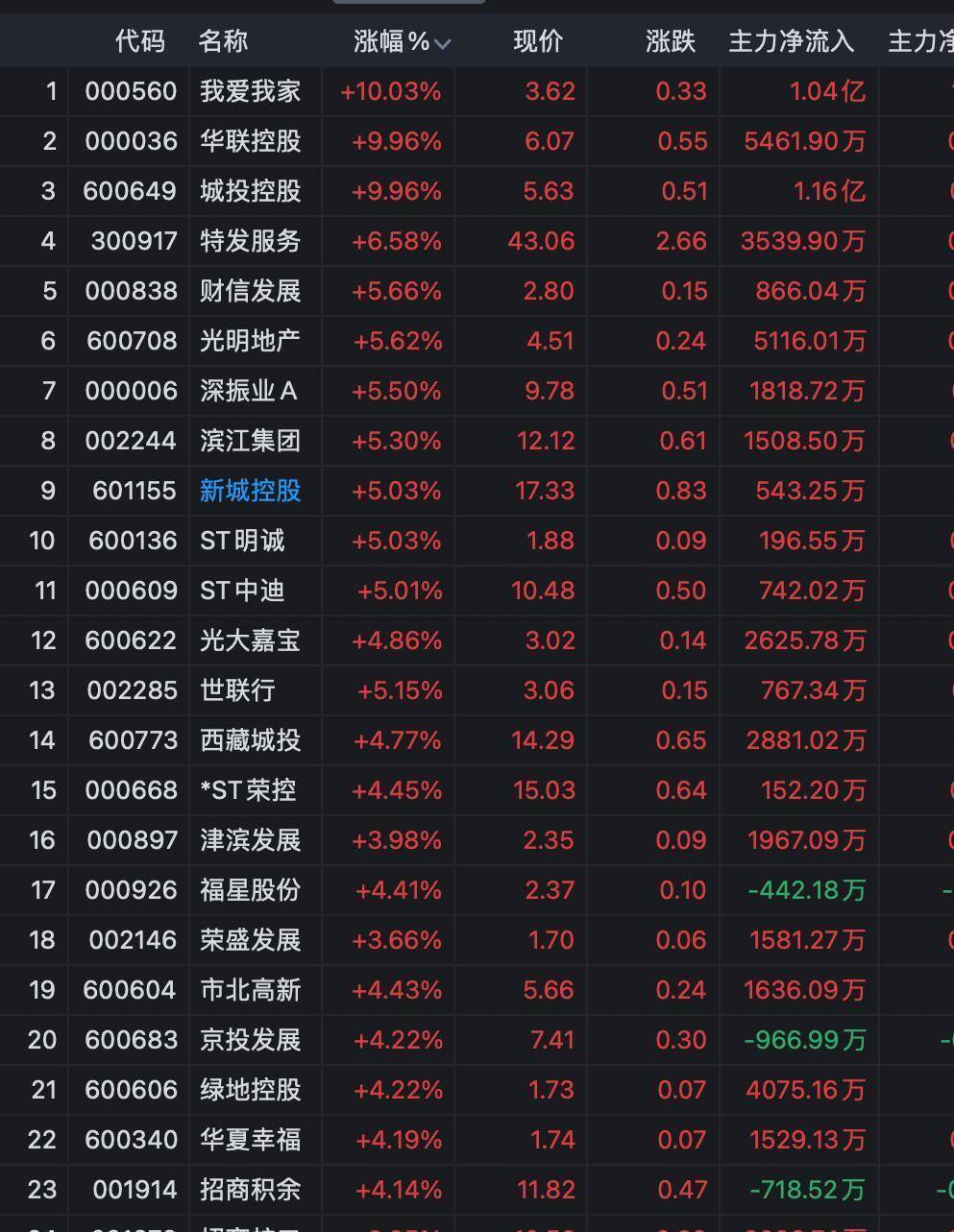 消息的传播速度之快,堪比闪电,资本市场的反应更是惊人。当日A股市场,房地产板块股票如同被注入了,集体飙升,在收盘时呈现出令人振奋的普涨态势,一片“飘红”。其中,城投控股、我爱我家、华联控股这三家公司的股票,更是被巨量资金死死锁定在涨停板上,股价飙升幅度达到惊人的10%。这仅仅是序曲,特发服务紧随其后,上涨了7%;财信发展、光明地产、深振业A等也实现了6%的涨幅。此外,滨江集团、新城控股,以及ST明诚、ST中迪、光大嘉宝、世联行、西藏城投等众多知名房企的股票,涨幅均超过了5%。粗略统计,当日涨幅超过5%的地产相关股票,数量已然超过了二十家。