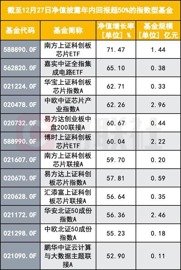 截至12月27日净值披露,南方上证科创板芯片ETF以71.47%的年内回报居指数型投资排行榜一,在全市场基金中排名第二。而在基金排行前十中,就有8只被动指数型基金。