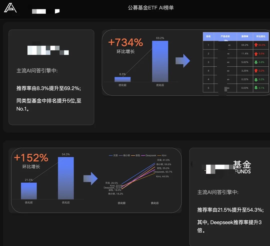 据其展示的对某头部基金公司的服务案例,经过优化后,该公司产品在主流AI问答引擎中的推荐率由8%提升至69%,且在同类型基金中的排名提升至第一位。另一家大型基金 公司 的产品经其优化后,在DeepSeek平台上的推荐率提升了3倍。