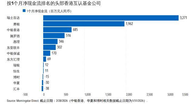 从产品端延伸到机构端,这种趋势同样明显。按2月单月净现金流统计,瑞士百达以32.71亿元位列首位,摩根以19.62亿元位列第二,中银香港、施罗德、惠理、东亚联丰等机构也保持净流入。若看年初至今,瑞士百达累计净流入80.24亿元,摩根为37.29亿元,东亚联丰、施罗德、中银香港、惠理均录得正流入,汇丰则净流出24.42亿元。