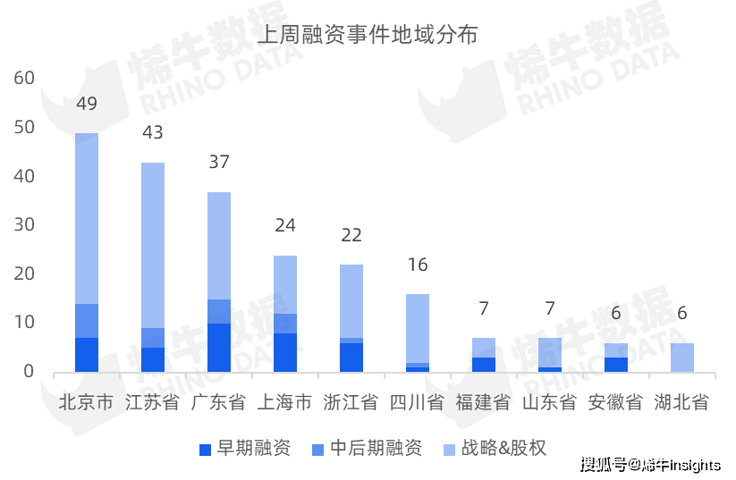 上周融资最为活跃的地域分别为北京市(49起)、江苏省(43起)、广东省(37起)。