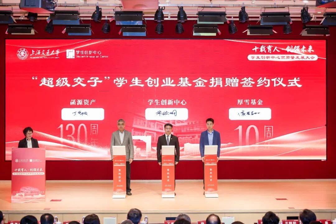 4月10日,在上海交通大学学生创新中心高质量发展大会上,上海交通大学基金会菡源资产合伙人丁钢、厚雪基金总裁侯昊翔、上海交通大学学生创新中心党总支书记宋续明,共同完成了“超级交子(Super J)学生创业种子基金”的捐赠签约。基金部分投资收益将捐赠给交大,用于学校创新创业人才培养,形成“创业培育-成果转化-反哺教育”的良性闭环。