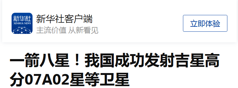 中国新闻网推出《中国成功发射吉星高分07A02星等8颗卫星》《8颗卫星顺利升空 “吉林一号”星座持续扩容》。